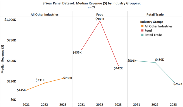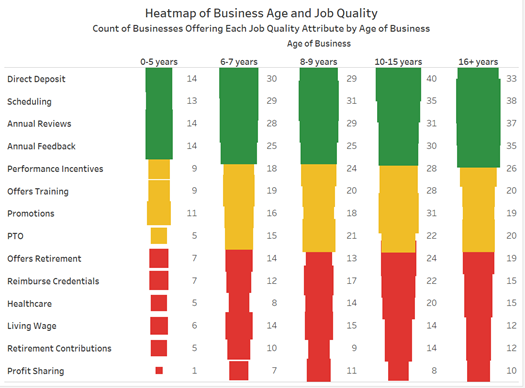 The first group with strong wealth-building characteristics enjoyed higher revenues and steady incomes, likely creating the financial cushion to invest in worker benefits. For instance, these mature businesses reported revenues 14x higher than their counterparts with revenues of $890,000 vs $61,000. Additionally, this first group with leading job quality had been in business nearly twice as long with an average of nine years versus five years in operation.